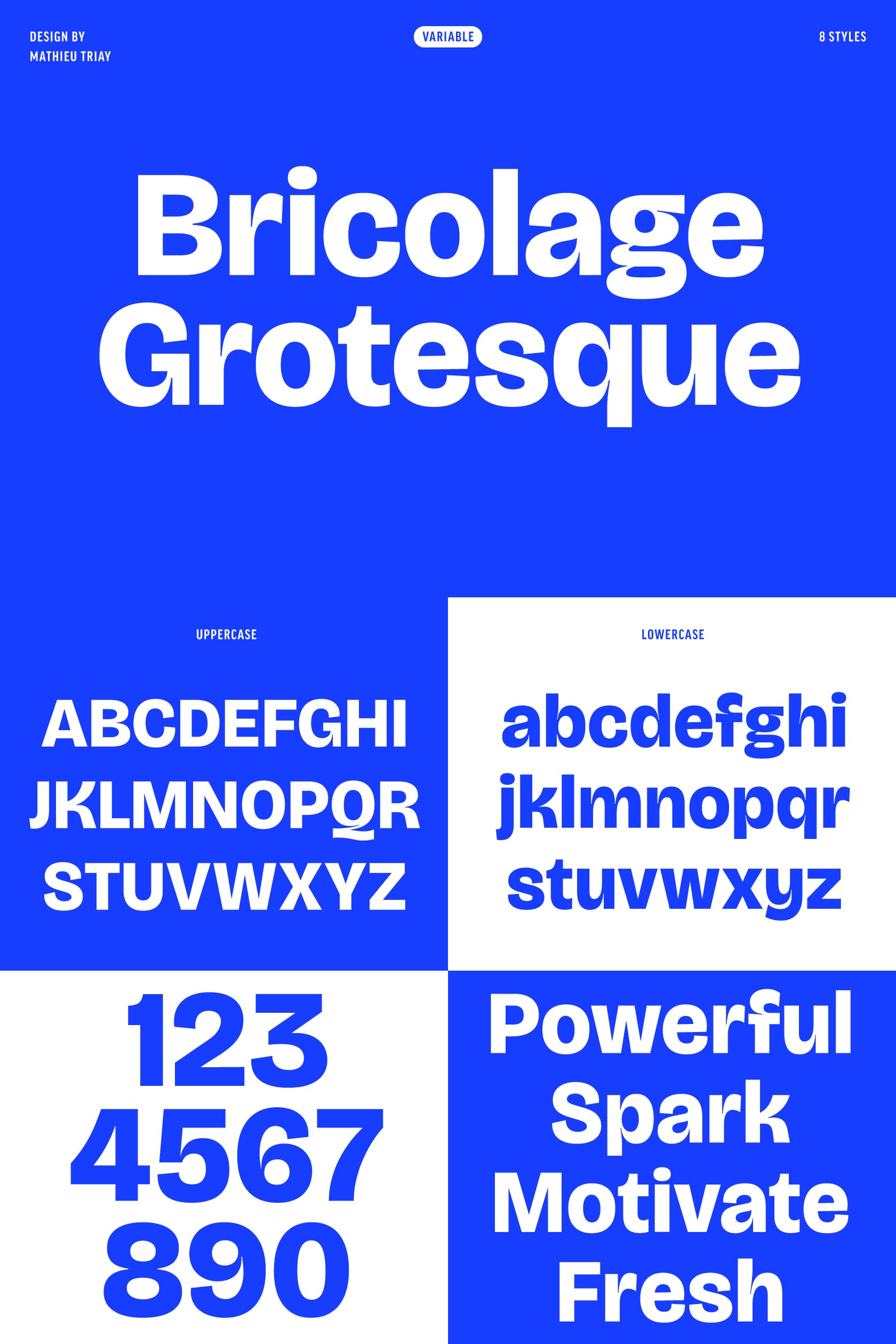 Bricolage Grotesqueは、60年代のフランス・タイポグラフィの要素に、イギリス的なコンデンス書体の特徴を加えた書体です。エネルギッシュかつ個性的でありながら、読みやすさも兼ね備えています。8つのウェイトを含み、バリアブルフォントにも対応しています。