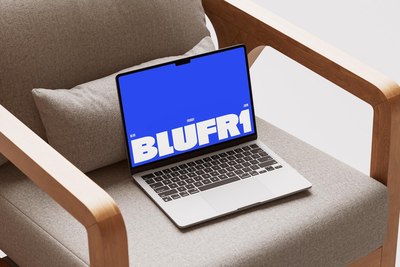 アームチェアのクッションに置かれたMacBookのモックアップ素材。高級感がありながらも、温かな雰囲気を演出します。