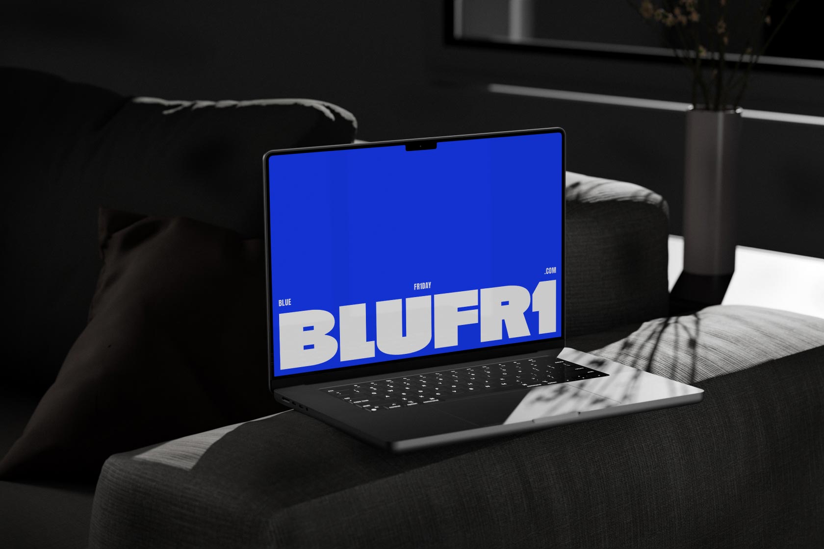 ソファーの上に置かれたMacBook Proのモックアップ素材。引き込まれるような、独特の世界観が印象的です。