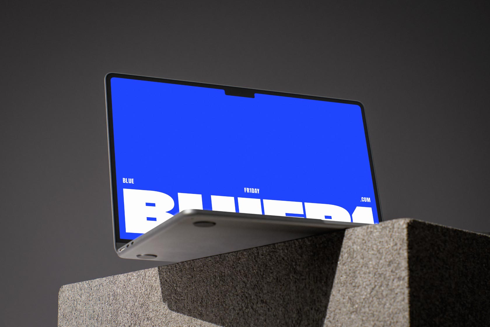 コンクリートブロックに置かれた、モダンな雰囲気のMacBookのモックアップ素材。このほかにも、別アングルのモックアップ素材が2つ含まれています。
